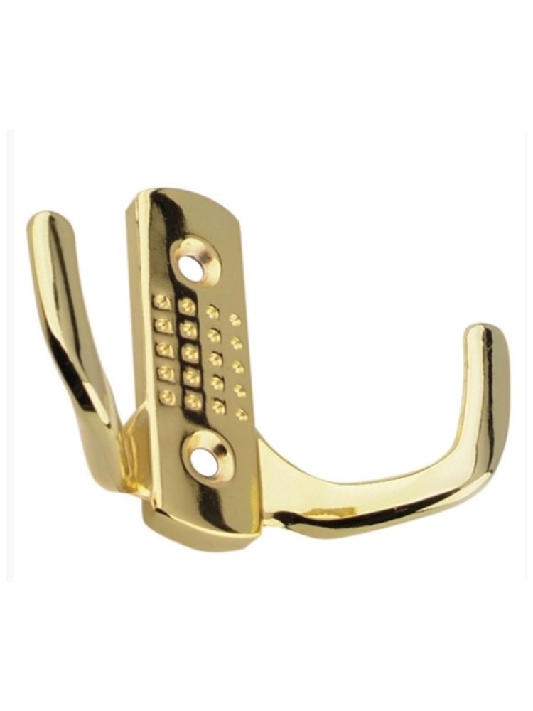 Металлический крючок с двумя рожками для одежды и аксессуаров, покрытие золото, выдерживает умеренную нагрузку, подходит для дома и офиса.