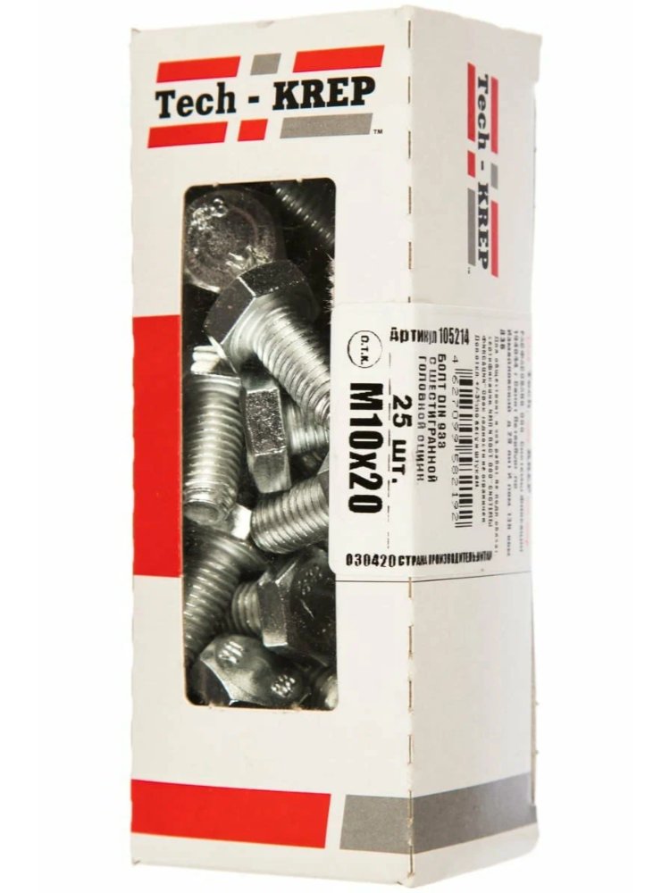 Болт DIN 933 с шестигранной головкой, оцинкованный, М10х20, Tech-Krep. Упаковка 25 шт. в коробке с окном. Прочный, устойчив к коррозии, для надежного крепления.