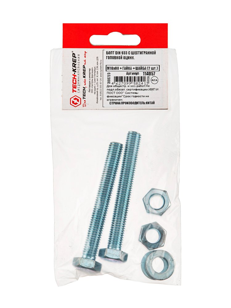 Комплект крепежных элементов включает болт с шестигранной головкой DIN 933, оцинкованный, размером М10х80, а также соответствующую гайку и две шайбы. Изделия изготовлены из высококачественной стали с цинковым покрытием, что обеспечивает защиту от коррозии и долговечность в условиях повышенной влажности. Болт имеет полную резьбу, что гарантирует надежное соединение деталей. Комплект упакован в практичный пакет от производителя Tech-Krep, что упрощает хранение и транспортировку. Подходит для выполнения монтажных и строительных работ, обеспечивая прочное крепление конструкций.