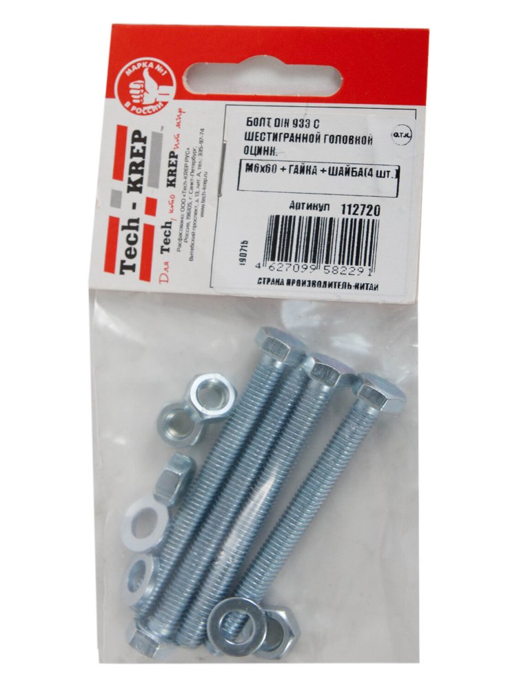 Комплект крепежных элементов включает болт с шестигранной головкой по стандарту DIN 933, размером М6х60, с оцинкованным покрытием для защиты от коррозии, а также соответствующую гайку и шайбу в количестве 4 штук. Упаковка выполнена в удобном пакете от бренда Tech-Krep, что обеспечивает компактное хранение и транспортировку. Изделие изготовлено из высокопрочной стали, что гарантирует надежность соединений при различных нагрузках. Болт подходит для сквозного монтажа, обеспечивая прочное крепление конструкций.