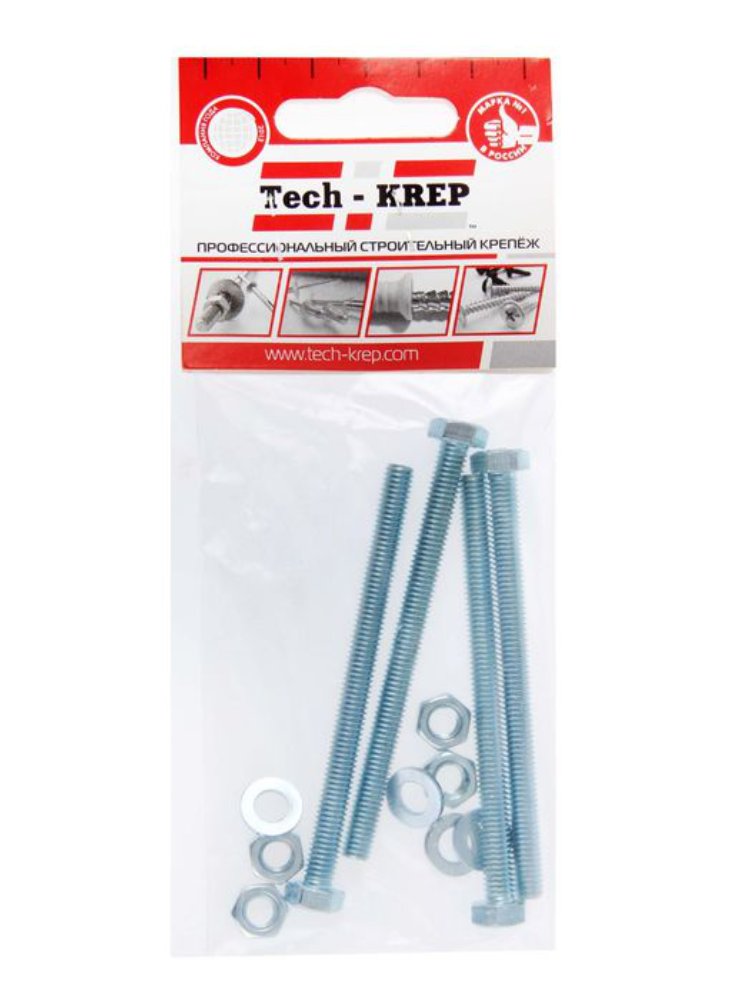 Болт DIN933 с шестигранной головкой оцинк. М6х80 + гайка + шайба (4 шт) - пакет Tech-Krep