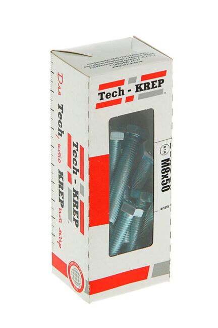 Болт DIN 933 с шестигранной головкой, оцинкованный, М8х50, 20 шт. в коробке с окном от Tech-Krep. Прочный, устойчив к коррозии, для надежного крепления.