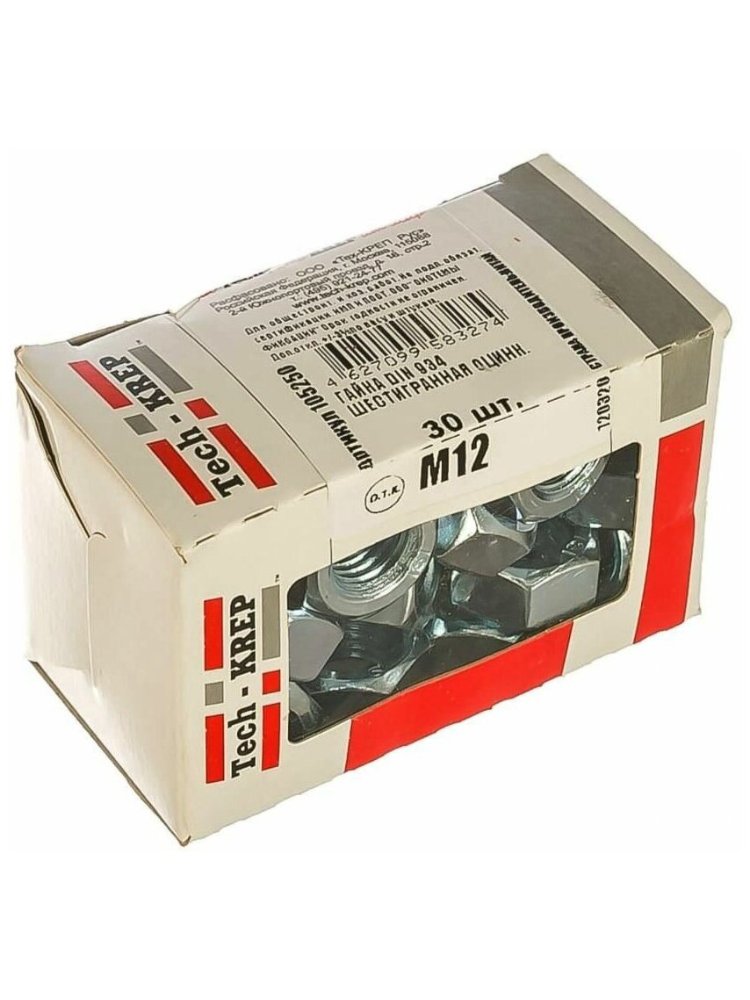 Гайка шестигранная оцинк. М12 DIN 934 Tech-Krep, 30 шт в коробке с окном. Прочный крепеж из стали с защитой от коррозии для надежных соединений.