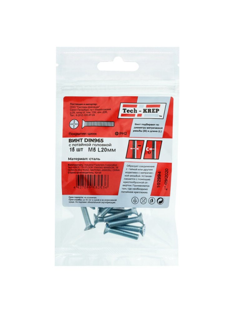 Винт DIN 965 с потайной головкой, оцинкованный, М5х20, 15 шт. в упаковке Tech-Krep. Прочный, устойчив к коррозии, для дерева и металла.