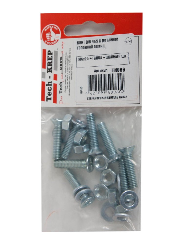 Винт DIN965 с потайной головкой оцинкованный M6х25 в комплекте с гайкой и шайбой (8 шт.) от Tech-Krep — это надежный крепежный элемент, изготовленный из углеродистой стали с цинковым покрытием для защиты от коррозии. Потайная головка обеспечивает аккуратный монтаж, позволяя винту быть незаметным на поверхности материала. Комплект идеально подходит для соединения деталей в условиях, где требуется эстетичный внешний вид и прочное крепление.