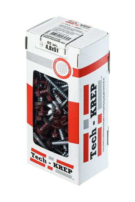 Саморез кровельный Tech-Krep 4,8х51 мм, цвет RAL-3005 (винно-красный), 60 шт. в коробке с окном. Для крепления кровли к металлу и дереву, с EPDM-шайбой.