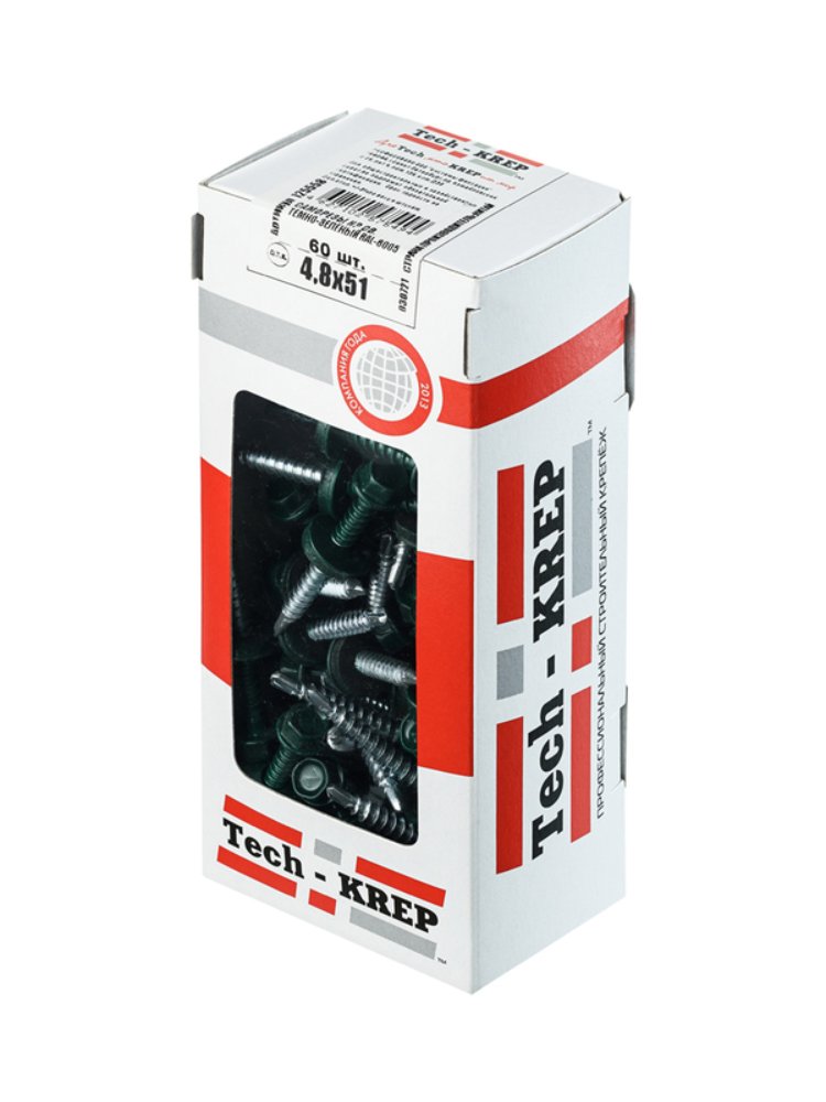 Саморез кровельный 4,8х51 мм в цвете RAL-6005 (зеленый) от Tech-Krep предназначен для крепления кровельных материалов к металлическим или деревянным конструкциям. Изготовлен из прочной углеродистой стали с антикоррозийным цинковым покрытием, что обеспечивает долговечность даже в условиях повышенной влажности. Шестигранная головка с пресс-шайбой и EPDM-прокладкой гарантирует герметичность соединения и защиту от протечек. В упаковке 60 штук, что удобно для небольших и средних объемов работ. Коробка с окном позволяет легко оценить содержимое без вскрытия.