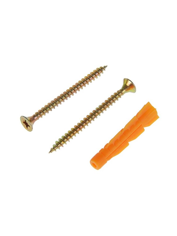 Комплект: 16 универсальных саморезов 4×50 мм с антикоррозийным покрытием и дюбелями 6×37 мм для прочного монтажа в любые материалы.