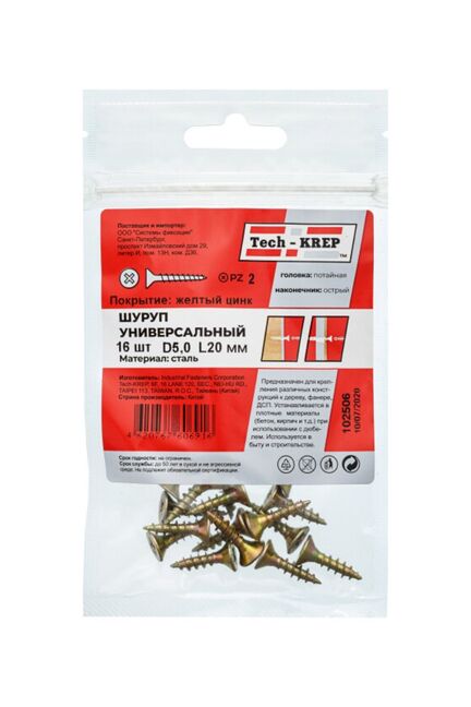 Саморез универс. желтый 5,0х20 пот. гол. (16 шт) - пакет Tech-Krep в Спасск-Дальний