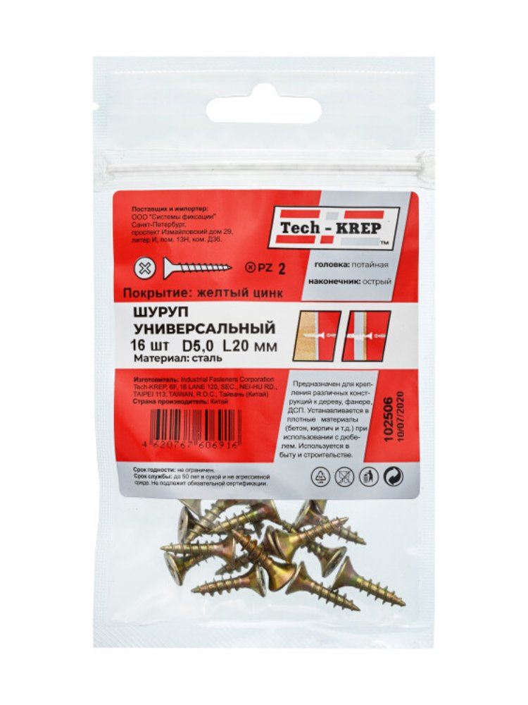 Саморез универс. желтый 5,0х20 пот. гол. (16 шт) - пакет Tech-Krep