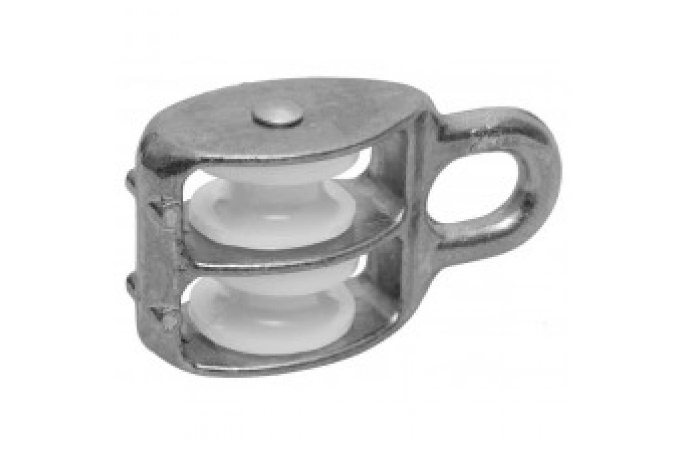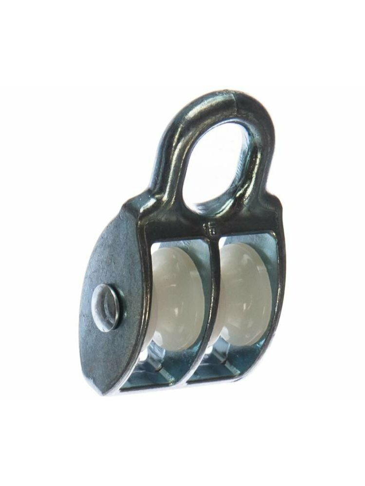 Блок грузовой с двумя нейлоновыми кольцами-шкивами. Имеет дугообразное кольцо в монолите с самим корпусом для крепления крюка или карабина. Такелажный блок применяется в грузоподъёмных конструкциях, для погрузки – подъёма, спуска груза. Используется для изменения вектора движения не стального троса для увеличения силовой тяги в грузоподъёмном механизме, при тяговом усилии на подъём. Двойной блок с нейлоновыми роликами 30 мм для плавного перемещения тросов, устойчив к износу и идеально подходит для строительных работ.