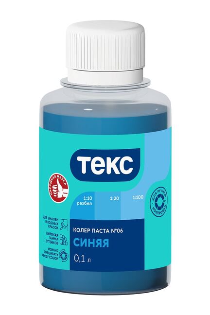 Колеровочная паста универсальная для эмалей, масляных и водно-дисперсионных красок. Для колеровки фасадных красок рекомендуется использовать только колер пасты: Кофейная №10, Бежевая №15, Карамель №22, Охра №09 . Не рекомендуется использовать для колеровки известковых и силикатных красок. Колер паста не используется в чистом виде. Яркий синий универсальный колер 0,1 л для колеровки красок и штукатурок, подходит для водных, масляных и акриловых основ, стойкий и легко смешивается.