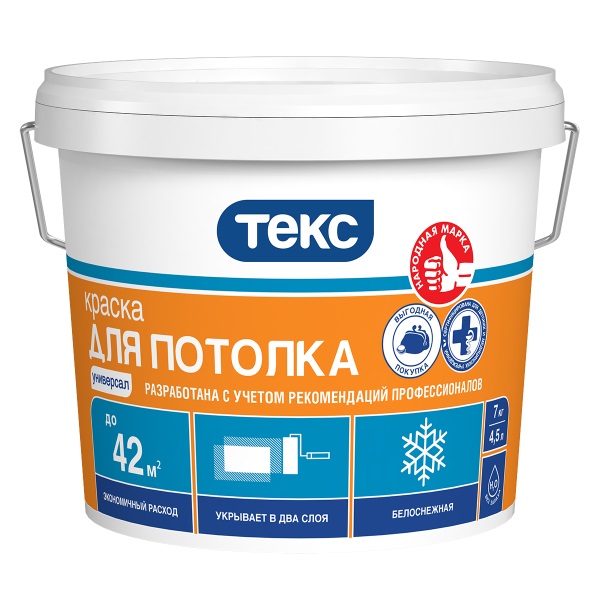 Для окраски потолков и верхних панелей стен внутри сухих помещений по бетонным, оштукатуренным, гипсокартонным, кирпичным и деревянным поверхностям. Глубокоматовая. Время высыхания 1,5 часа. Следующий слой можно наносить через 1,5 часа. Расход 5-7 м²/кг (8-10 м²/л) по ровной невпитывающей поверхности; 4-6 м²/кг (6-9 м²/л) по неровной впитывающей поверхности. Разбавитель - вода. Матовое белое покрытие для потолков, без запаха, быстро сохнет, легко наносится, подходит для жилых и детских помещений.