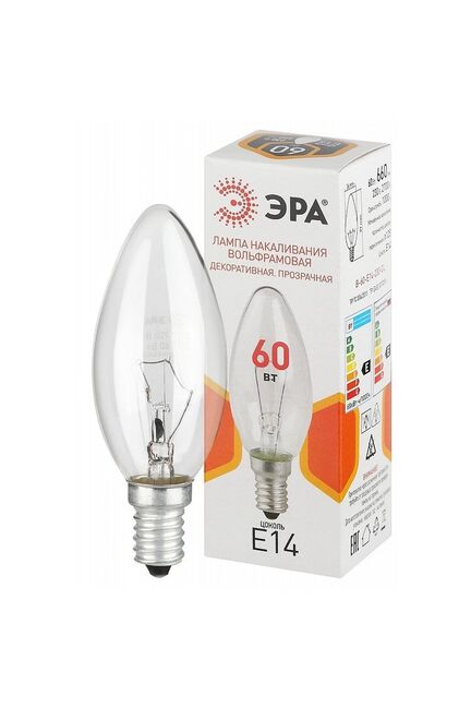 Лампа накаливания вольфрамовая для бытового и аналогичного общего освещения. Лампа с колбой в виде свечи используется для декоративного оформления светильника, придания ему законченного и совершенного вида. Она красиво смотрится, создавая эффект настоящей зажженной свечи, что привносит в интерьер комнаты более уютный, успокаивающий и "теплый" вид. Прозрачная колба лампы создана специально для эффектов абсолютно чистого, искрящегося света. Лампа 60Вт с цоколем E14 обеспечивает яркое освещение, быстро включается, простая установка,  идеальна для бытовых и хозяйственных помещений.