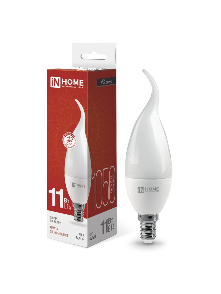 Светодиодная лампа IN HOME LED-СВЕЧА НА ВЕТРУ-VC 11Вт 230В Е14 4000К с формой колбы «свеча на ветру» – бесспорный фаворит любителей классических интерьеров, а технология «Vision Care» делает ее привлекательной для всех, кто хочет сохранить здоровое зрение. Матовая светодиодная лампа излучает ровный, комфортный для глаз свет без пульсации и мерцания. Яркая LED-лампа 11 Вт E14, 1050 Лм, 4000К, долговечная, экономичная, матовая, идеальна для дома, офиса, бра и люстр. Безопасна для зрения.