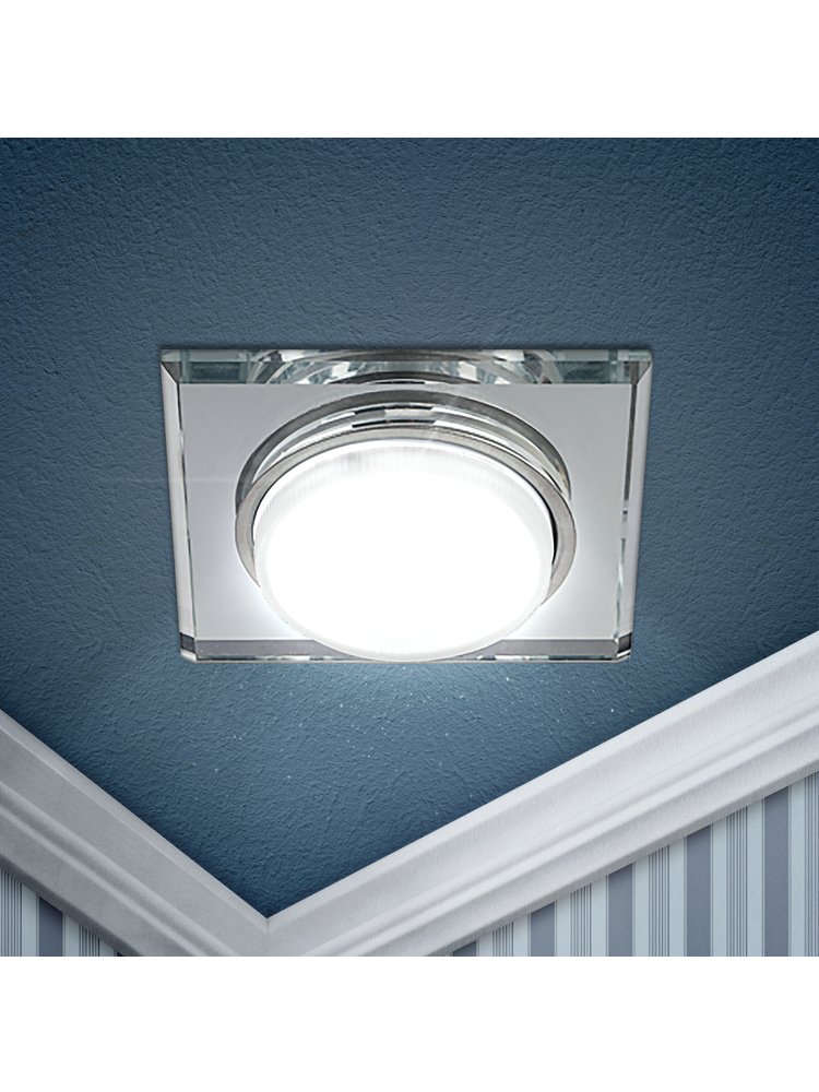 Максимальная мощность лампы составляет 15 Вт. Корпус встраиваемого светильника изготовлен из алюминия, что делает его особенно удобным и надежным в использовании. Диаметр отверстия, требуемого для установки светильника составляет 85 миллиметров, а размер корпуса светильника – 120x120 миллиметров. Стильный зеркальный светильник GX53, простой монтаж, подходит для любых интерьеров, универсален для жилых и коммерческих помещений.