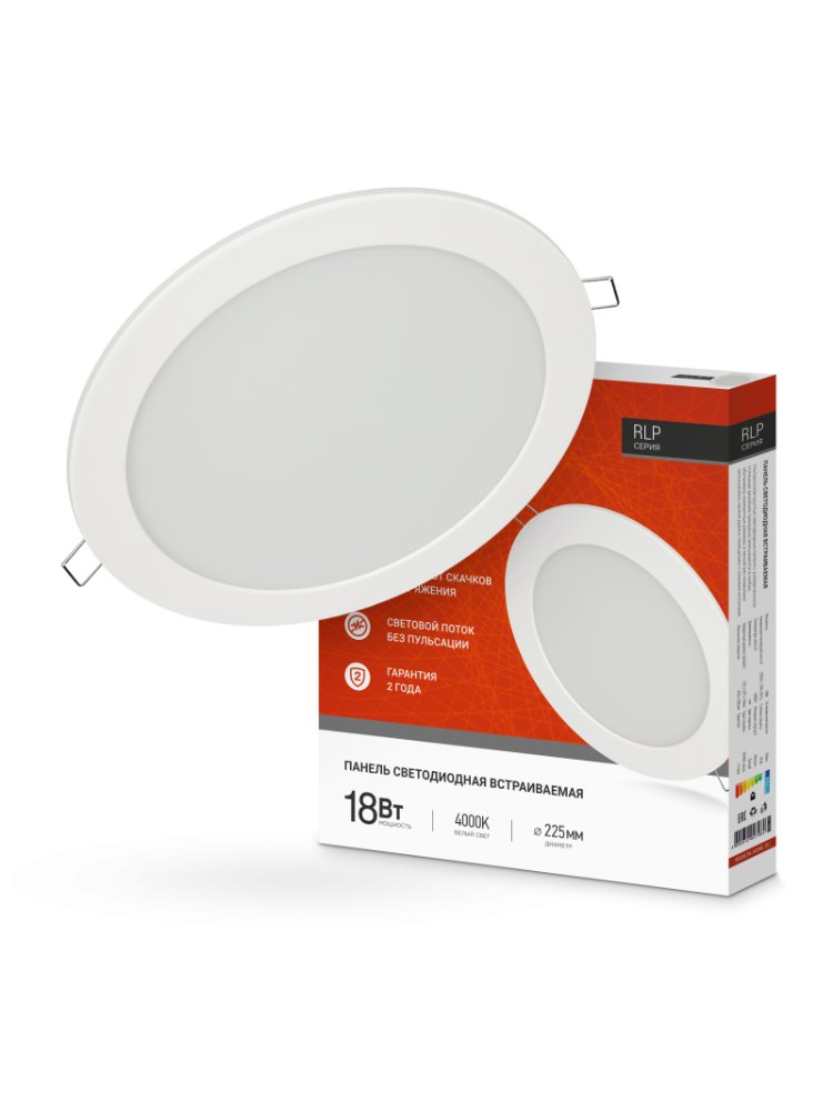 Встраиваемая круглая панель 18 Вт, 230 В, 4000 К, 1080 Лм, d225 мм — экономичный и равномерный свет для любого помещения без мерцания.