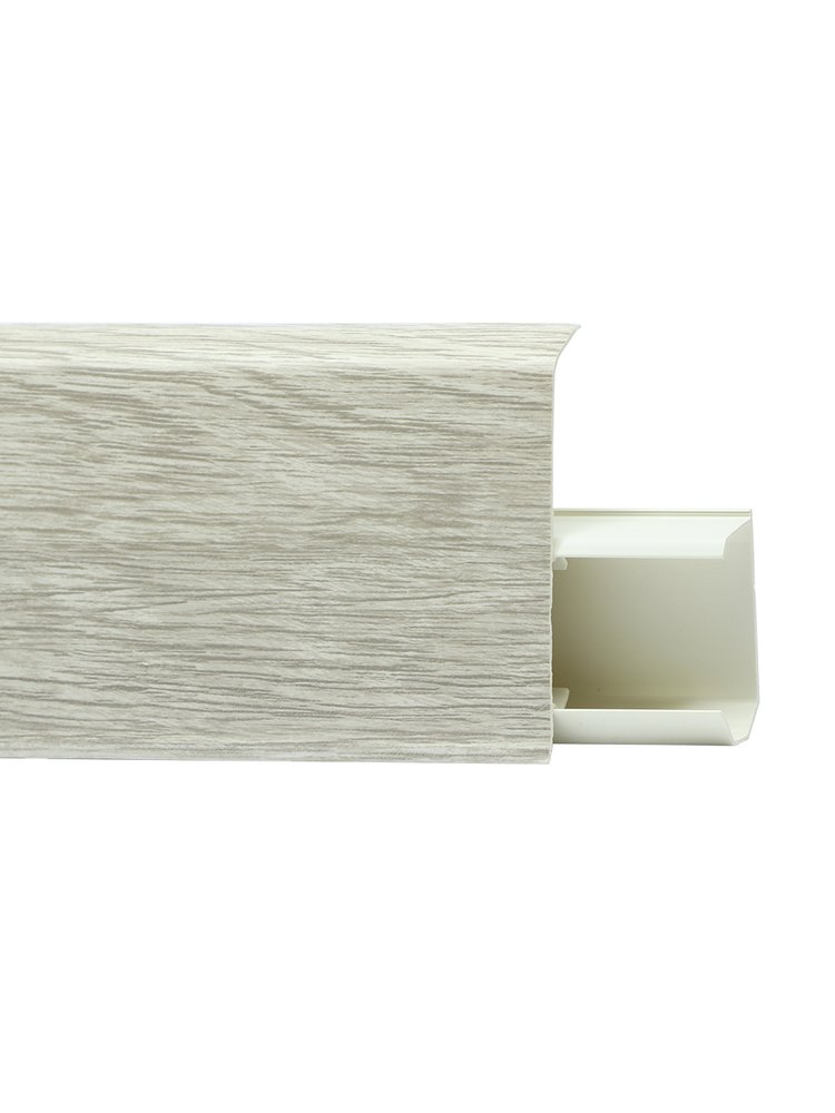 Утонченный и высокий профиль (72 мм) с острыми краями. Благодаря съёмной панели монтаж электрических проводов, покраска стен, оклеивание обоями возможны без демонтажа профилей. Конструкция позволяет монтировать и демонтировать плинтус без использования инструментов. Существует возможность размещения большого количества проводов, в том числе после монтажа. Специальная двухслойная технология: помимо слоя краски, дополнительно покрывается специальным лаком, благодаря чему его покрытие становится однородным, а это дополнительно защищает изделие от разного вида механических повреждений и вредного воздействия лучей УФ. Благодаря эластичному материалу, плинтус идеально прилегает даже к неровностям стен и полов. Плинтус 72 мм длиной 2,2 м, влагостойкий, с имитацией дуба, защищает стены и скрывает кабели, подходит для жилых и коммерческих интерьеров.