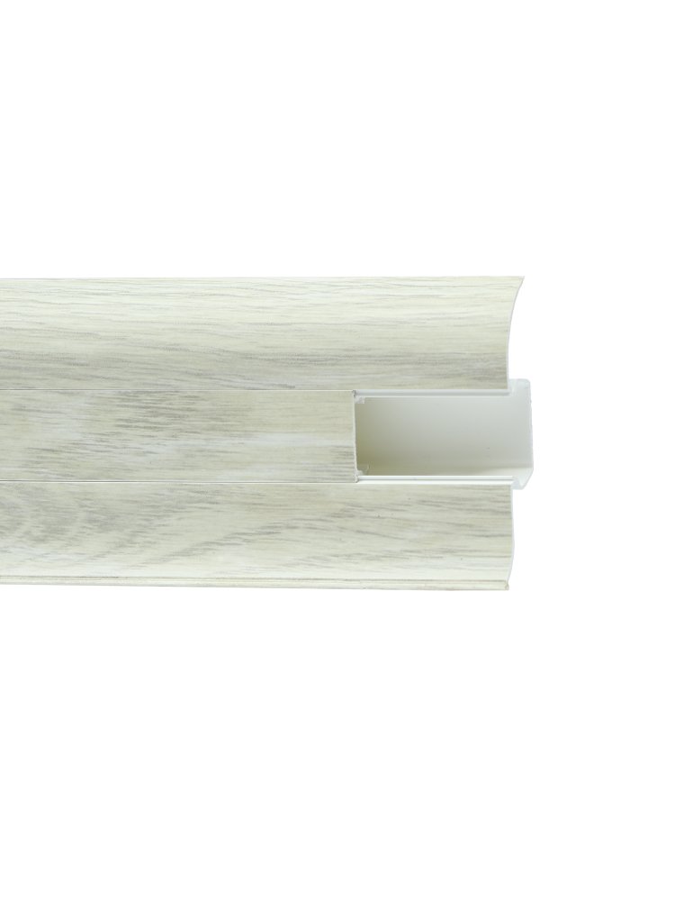 Утонченный и высокий профиль (58 мм) с острыми краями. Благодаря съёмной панели монтаж электрических проводов, покраска стен, оклеивание обоями возможны без демонтажа профилей. Конструкция позволяет монтировать и демонтировать плинтус без использования инструментов. Существует возможность размещения большого количества проводов, в том числе после монтажа. Специальная двухслойная технология: помимо слоя краски, дополнительно покрывается специальным лаком, благодаря чему его покрытие становится однородным, а это дополнительно защищает изделие от разного вида механических повреждений и вредного воздействия лучей УФ. Благодаря эластичному материалу, плинтус идеально прилегает даже к неровностям стен и полов. Плинтус Wimar Дуб Аргенто 58 мм, длиной 2,5 м из МДФ с износостойким покрытием. Стильный дизайн, простая установка, защита стыков пола и стен.