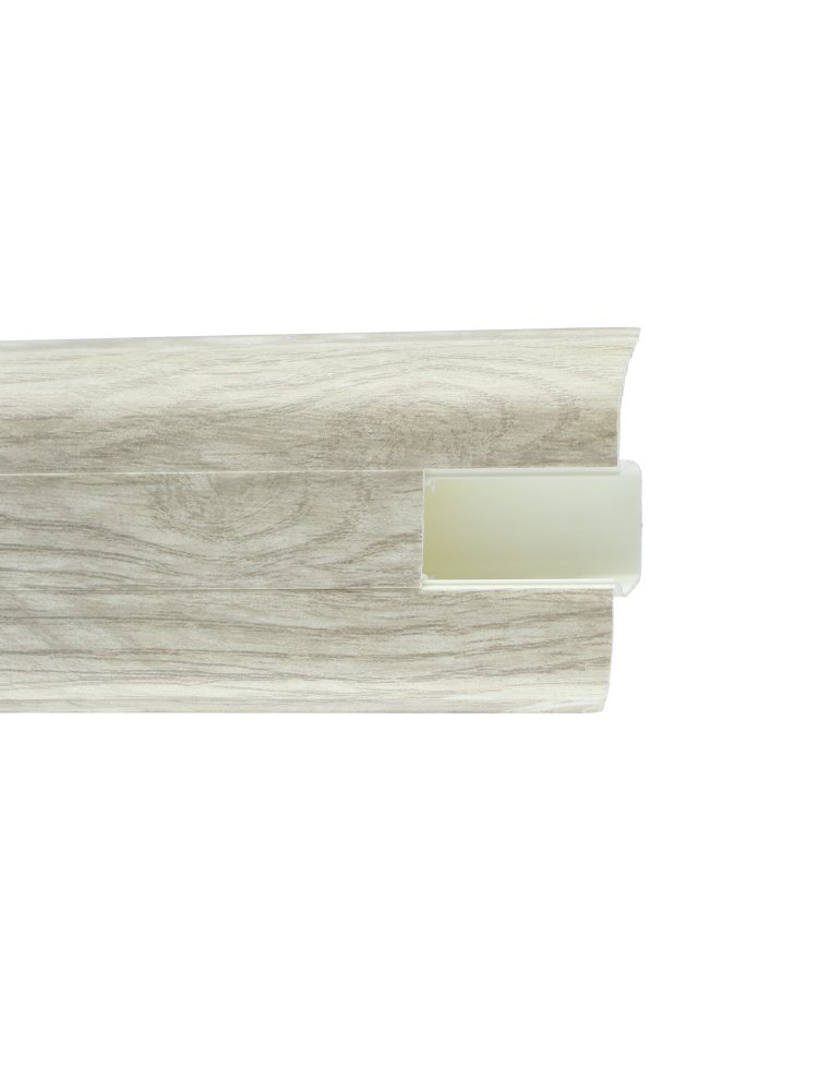 Утонченный и высокий профиль (58 мм) с острыми краями. Благодаря съёмной панели монтаж электрических проводов, покраска стен, оклеивание обоями возможны без демонтажа профилей. Конструкция позволяет монтировать и демонтировать плинтус без использования инструментов. Существует возможность размещения большого количества проводов, в том числе после монтажа. Специальная двухслойная технология: помимо слоя краски, дополнительно покрывается специальным лаком, благодаря чему его покрытие становится однородным, а это дополнительно защищает изделие от разного вида механических повреждений и вредного воздействия лучей УФ. Благодаря эластичному материалу, плинтус идеально прилегает даже к неровностям стен и полов. Практичный плинтус 2,5 м с кабель-каналом, высотой 58 мм, цвет дуб новарский. Легкий монтаж и долговечный материал для стильного интерьера.