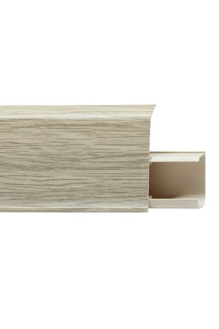 Прочный плинтус в современном древесном оттенке отлично дополняет интерьер, скрывает стыки напольных покрытий и защищает стены от повреждений. Идеально подходит для жилых, офисных и коммерческих помещений благодаря универсальному дизайну и стойкости к износу.