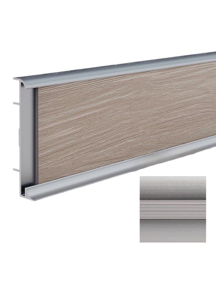 Используется для ровных стен. Имеет пазы для вставки элемента напольного покрытия. Крепится на саморезы. Умеренно гибкий. Прочный алюминиевый плинтус 60 мм для коммерческих покрытий, устойчив к повреждениям и влаге, идеален для офисов и общественных помещений.