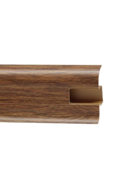 Утонченный и высокий профиль (58 мм) с острыми краями. Благодаря съёмной панели монтаж электрических проводов, покраска стен, оклеивание обоями возможны без демонтажа профилей. Конструкция позволяет монтировать и демонтировать плинтус без использования инструментов. Существует возможность размещения большого количества проводов, в том числе после монтажа. Специальная двухслойная технология: помимо слоя краски, дополнительно покрывается специальным лаком, благодаря чему его покрытие становится однородным, а это дополнительно защищает изделие от разного вида механических повреждений и вредного воздействия лучей УФ. Благодаря эластичному материалу, плинтус идеально прилегает даже к неровностям стен и полов.