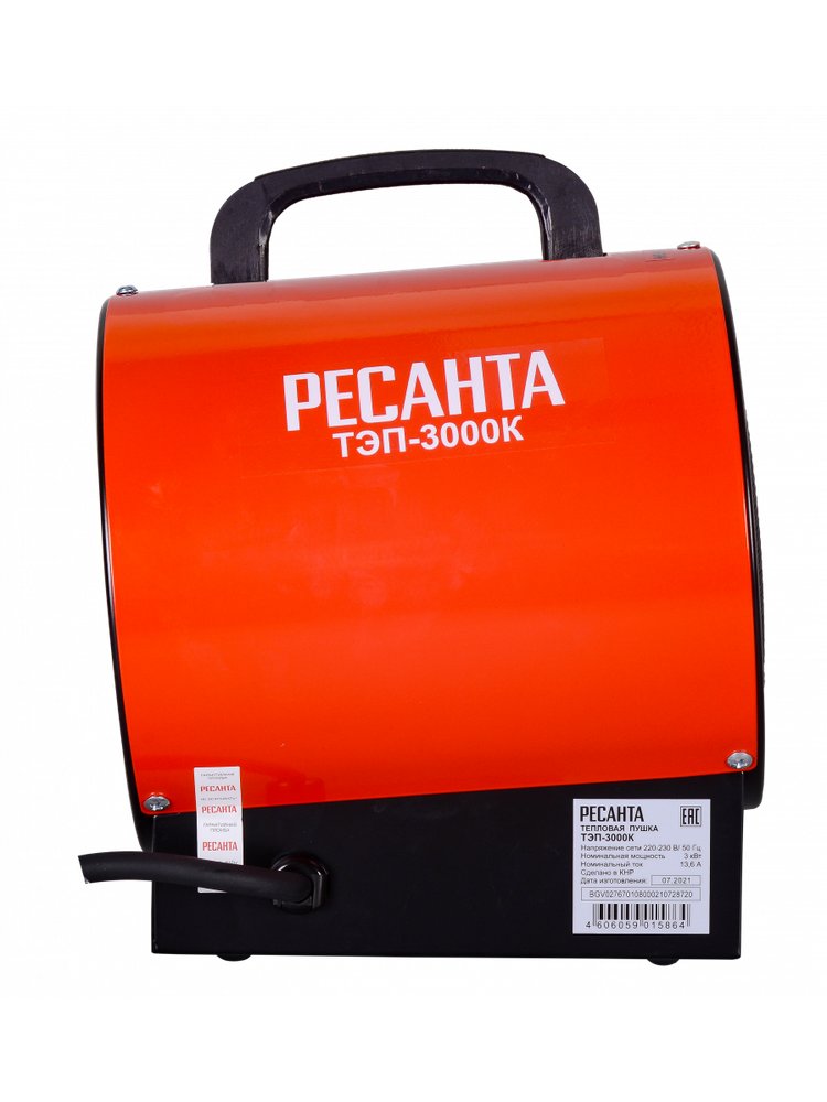 Тепловая пушка электрическая Ресанта ТЭП-3000К – мощный электроприбор, способный быстро прогреть большое помещение и поддерживать нужную температуру. Тепловая пушка Ресанта ТЭП-3000К, в которой в качестве нагревательного элемента служит ТЭН, произведена из прочного металла. Корпус имеет устойчивую опору, которая позволит избежать опрокидывания. Безопасность работы механизма обеспечивается функцией защиты от перегрева и встроенной решеткой, защищающей от попадания внутрь корпуса посторонних предметов. Тепловая пушка РЕСАНТА ТЭП-3000К, 3 кВт, круглая. Три режима работы, защита от перегрева, прочный корпус. Для обогрева и просушки помещений.