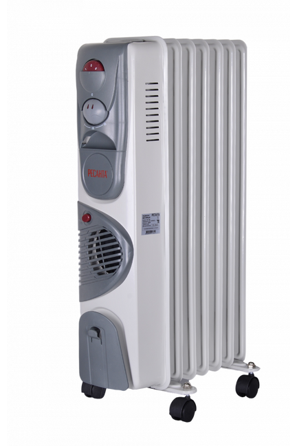 Масляный радиатор РЕСАНТА ОМ-7НВ, 1,9 кВт, с тепловентилятором, 7 секций, обогрев до 19 м², 3 режима, защита от перегрева, мобильный.