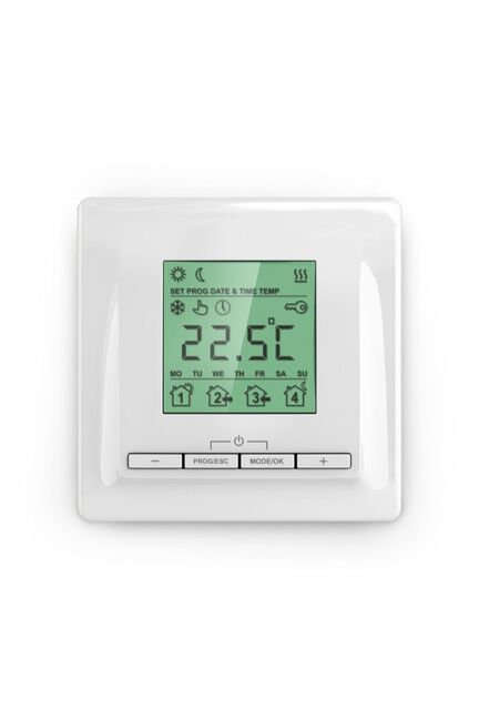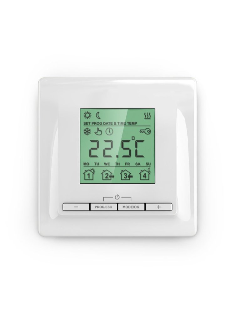 Терморегуляторы серии ТР 500 выполнены в уникальном дизайне. Особый стиль и современность визуально выделяют эти регуляторы из ряда аналогов и позволяют вписать их в любой интерьер. ТР 515. Для ценителей точности Индикация температуры на большом дисплее. Цифровое регулирование. Точность поддержания температуры. (+/- 0,5°С) Управление по двум датчикам температуры: пола и воздуха, как одновременно, так и по отдельности. Встроенные часы. Тип терморегулятора: цифровой; Напряжение питания: 220 В (+10% -15%); Максимальный коммутируемый ток нагрузки: 16 А (3,5 кВт); Потребляемая мощность (терморегулятор): 450 мВт; Масса: 150 г; Габариты: 86х86х35 мм; Степень защиты: Ip20; Класс защиты: II; Выносной датчик температуры пола (TST02): NTC 6,8 кОм; Длина установочного провода датчика: 2 м; Допустимая окружающая температура: от +5°С до +40°С; Допустимая отн. влажность воздуха: 80%; Пределы регулирования температуры: от +5°С до +35°С; Цвет корпуса: белый, кремовый Цифровой тер