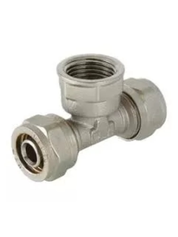 Тройник для металлополимерных труб 20*1/2"*20 мм с никелированием, подходит для водоснабжения и отопления, устойчив к коррозии и перепадам давления.
