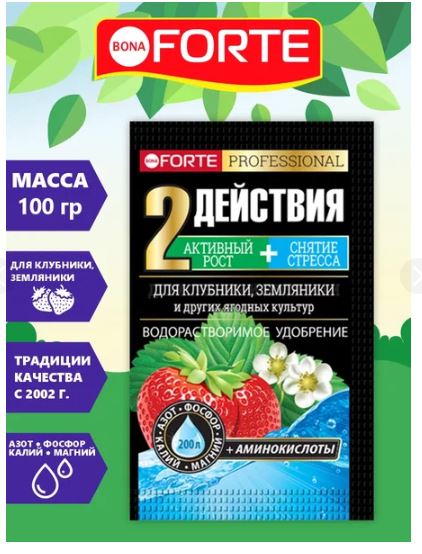 Подходит также для других ягодных кустарников. 2 в 1 Удобрение - стимулирует рост + Аминокислоты - снимают стресс. Можно использовать в сухом или жидком виде. Полностью водорастворимое удобрение. Экономично: 1 пакетик на 200 л воды. Стимулирует обильное плодоношение