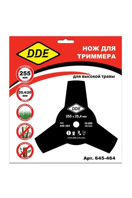 Диск для триммера DDE GRASS CUT 3-хлопастной, 255 х 25,4 мм, предназначен для кошения высокой травы. Изготовлен из углеродистой стали. Двухсторонняя заточка лезвий. Для равномерного износа рекомендуется переворачивать нож каждые 5 часов кошения. Регулярно затачивайте нож, после заточки обязательно проверяйте балансировку ножа. Рекомендуется для электрических и бензиновых триммеров с редуктором. Максимальные обороты 10 000. Толщина ножа 1,4 мм.