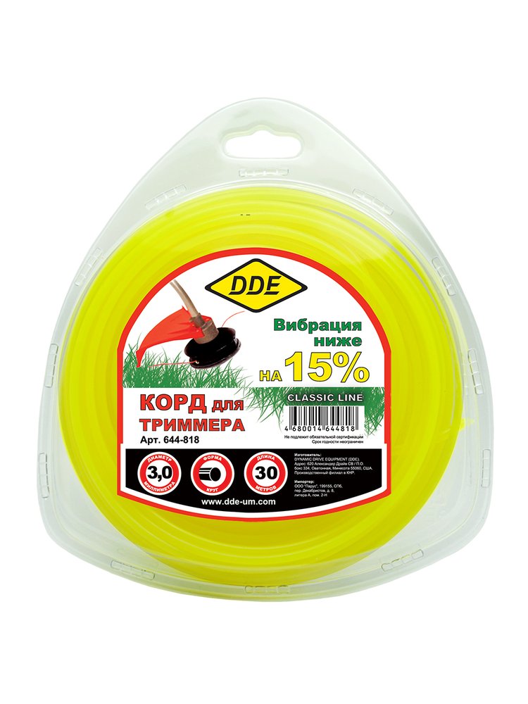 Триммерный корд DDE производится из материала сополимер-термопласт марки Luran S производимой мировым лидером, компанией BASF. Прочный триммерный корд 3 мм, длина 30 м, круглый срез, стойкий к износу, идеально подходит для скашивания травы любой жесткости.