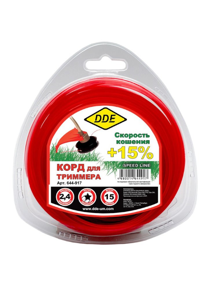Корд триммерный Speed line DDE применяется при работе с триммерами для кошения травы. Является режущим элементом и заправляется в триммерную головку. Изготовлен из износостойкого сополимер-термопласта марки Luran S. Выдерживает интенсивную эксплуатацию на высоких оборотах. Обладает высокой скоростью кошения. Корд сечением звезда, диаметр 2,4 мм, длина 15 м, идеально режет плотную траву, повышенная износостойкость и простота эксплуатации.