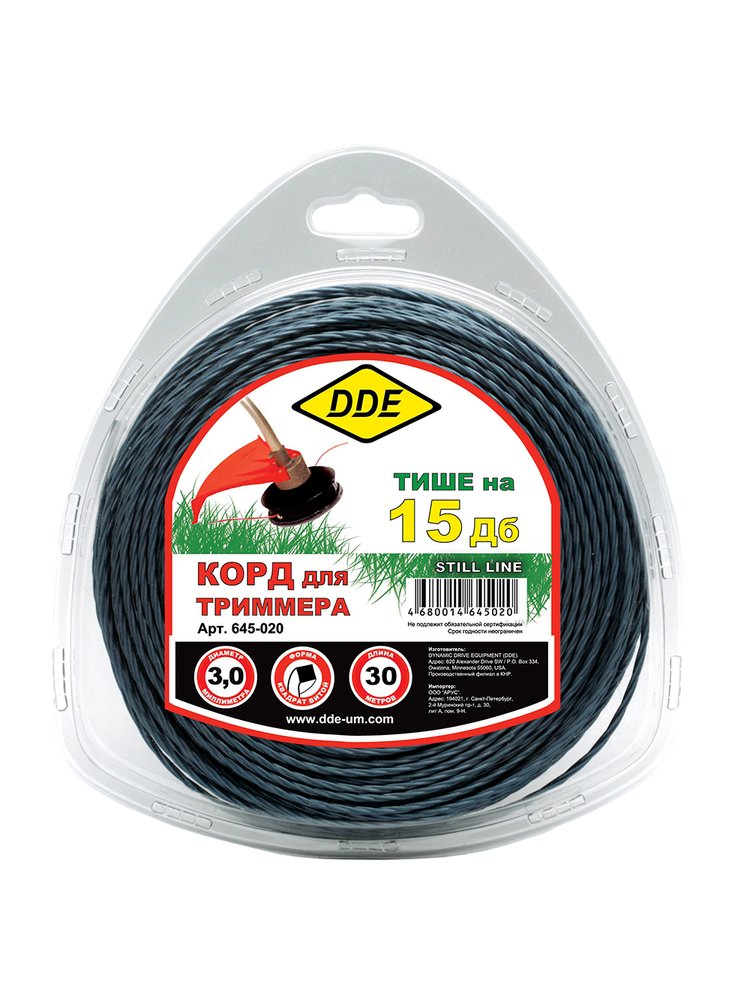 Триммерный корд DDE производится из материала сополимер-термопласт марки Luran S производимой мировым лидером, компанией BASF. Сечение - витой крест. Обладает высокой производительностью кошения и при этом пониженным шумом на 15Дб. Витой корд 3,0 мм, 30 м, сечение квадрат, нейлон — для жёсткой травы, долговечен, снижает шум и подходит большинству триммеров.