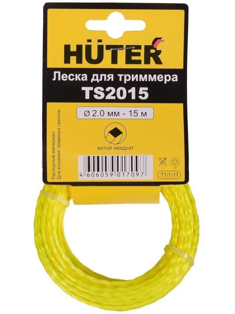 Профессиональная леска HUTER TS2015 для триммеров HUTER GET-1200SL. Витая леска 2,0 мм, квадрат, 15 м: высокая износостойкость, быстрый срез, подходит для триммеров, эффективна в борьбе с плотной травой.