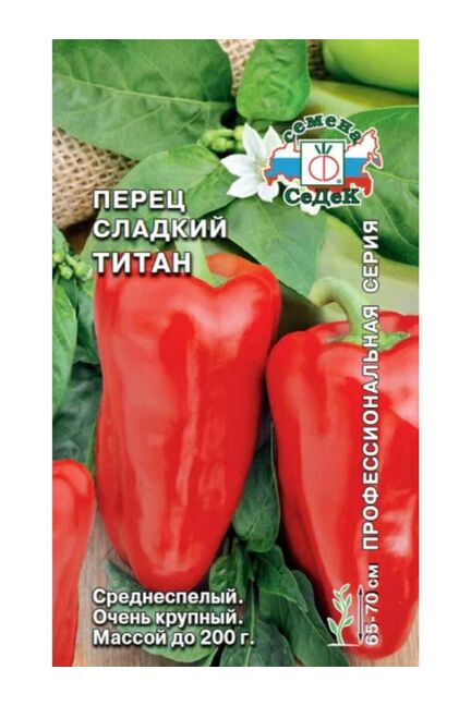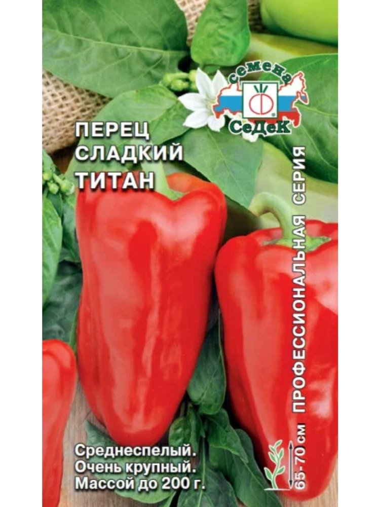 Семена сладкого перца Титан, 0,1 г, от СеДеК. Крупные плоды до 300 г, урожайность до 6 кг/м², толстая стенка, отличный вкус. Для открытого грунта и теплиц.
