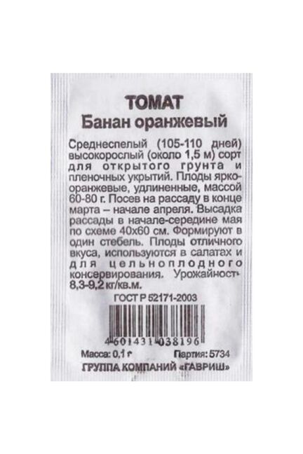 Семена Томат Банан оранжевый б/п Гавриш