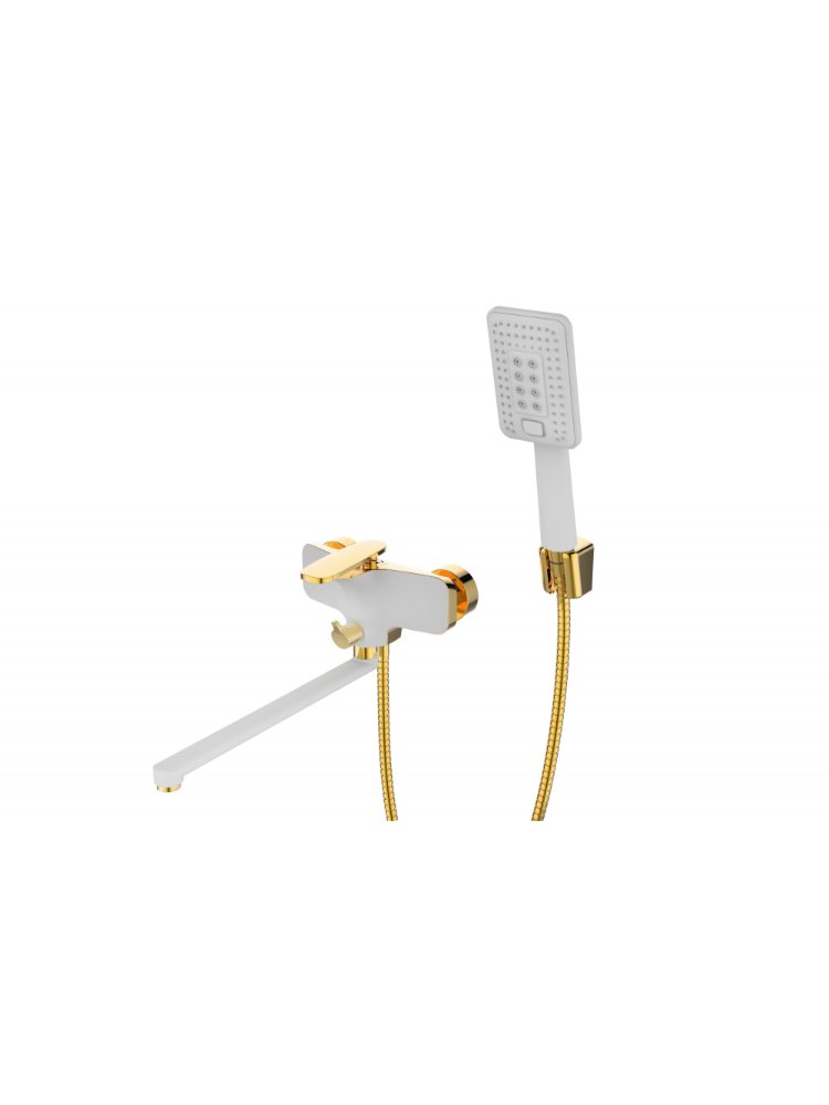 Элегантное сочетание белого и золотого оттенков придаёт интерьеру ванной комнаты неповторимый стиль и современность. Смеситель отлично подойдет для комплектации ванной комнаты в домах и квартирах, где ценят высокий эстетический уровень и надежность.