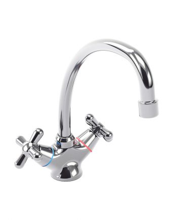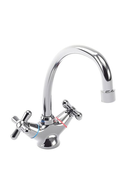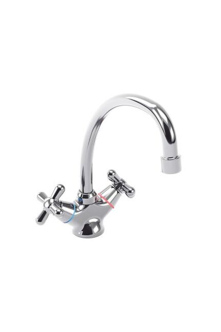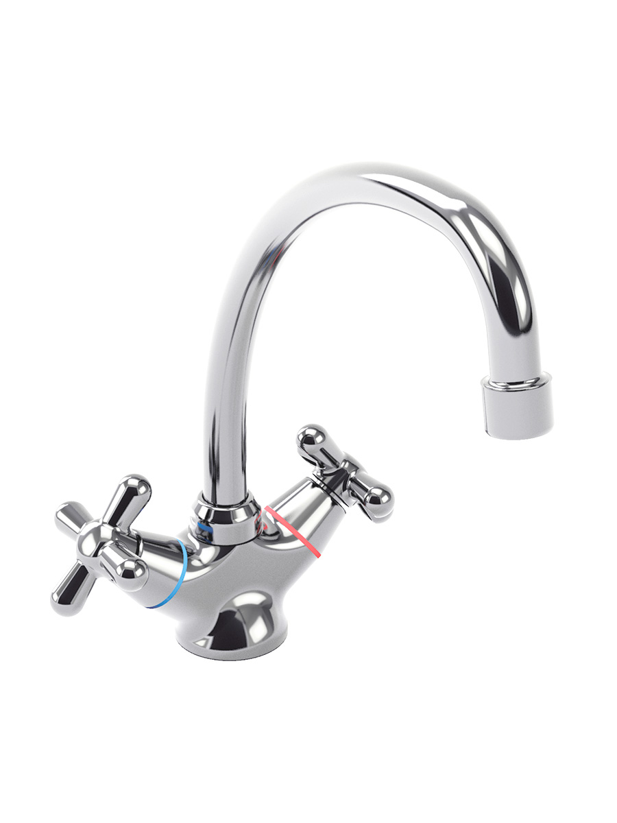 Двухвентильный смеситель для кухни с поворотным изливом, корпус из латуни, точная регулировка напора и температуры воды, легкая установка.