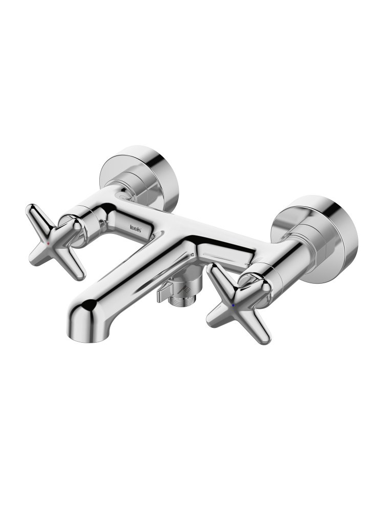 Двухвентильный смеситель для ванны с коротким изливом 6,9 см, из прочной латуни с хромированием, для настенного монтажа, без душкомплекта.