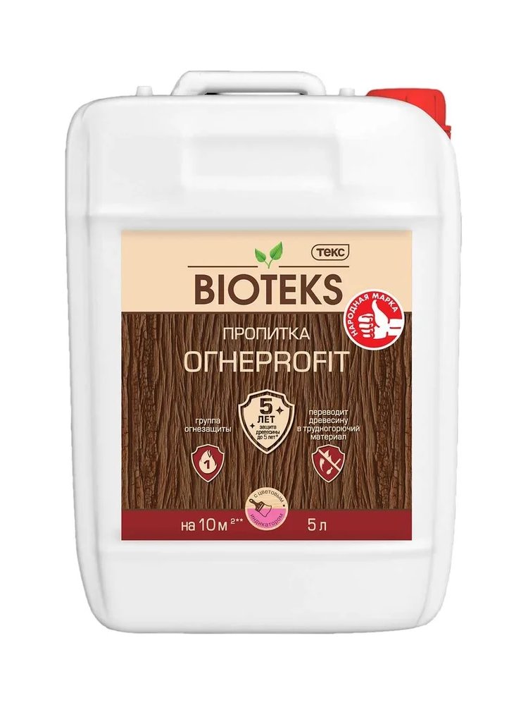 Предназначен для защиты от возгорания, распространения пламени и горения материалов из древесины (стропила, обрешетка чердачных помещений и т.п.) и материалов на ее основе, эксплуатируемых внутри и снаружи (под навесом) помещений. Время высыхания 1 час. Следующий слой можно наносить через – 3-4 часа. Суммарный расход Не менее 1л – на 2м² (без потерь) – обеспечивает 1 (наивысшую) группу огнезащиты. 1л – на 4м² – обеспечивает 2 (среднюю) группу огнезащиты. Огнезащита и биозащита в одном средстве, розовый индикатор для контроля нанесения, 5 л для внутренних и наружных деревянных конструкций.