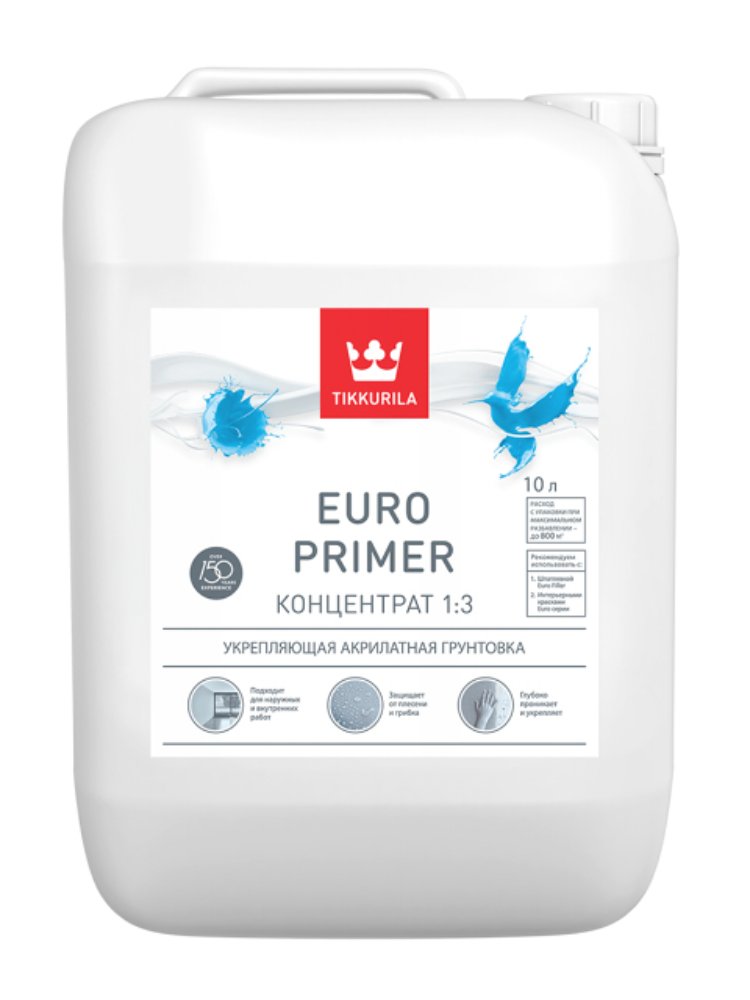Универсальная грунтовка-концентрат EURO PRIMER 1:3 идеальна для подготовки внутренних и наружных поверхностей к последующей отделке. Растворяется водой в пропорции 1:3, глубоко проникает вглубь основания, укрепляя даже слабые и пористые поверхности, снижая впитываемость и обеспечивая высокую адгезию финишных материалов.