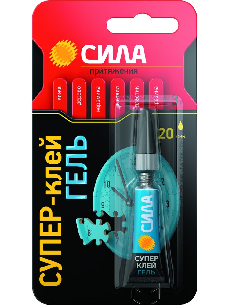 Супер-клей ГЕЛЬ СИЛА, идеально подходит для быстрого и эффективного ремонта различных предметов мебели, интерьера, обуви и т.д. Накрепко схватывает дерево, кожу, резину, стекло, фарфор и пластик, при этом супер клеи экономично расходуются и высыхают за несколько секунд. * 100% цианоакрилат с добавлением загустителя - высокая концентрация клеящих ингредиентов, обеспечивает крепкое, мгновенное соединение частей различных предметов. * Подходит для работ на вертикальных поверхностях. Гелевый клей 3 г, быстро