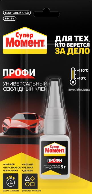 Супер Момент Профи Плюс Предназначен для всех видов быстрых ремонтных работ в быту, мастерской, автомобиле, при конструировании моделей. Инновационная упаковка в форме бутылочки позволяет хранить клей вертикально, можно видеть оставшееся количество клея. Удобная кисточка дает возможность равномерно наносить клей на разные по качеству и размеру поверхности.
