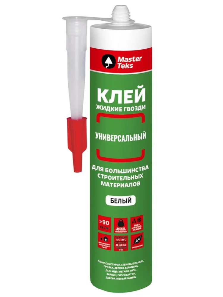 Полимерный клей универсального назначения обеспечивает прочное и долговечное крепление различных материалов на любых поверхностях. Он оптимален для внутренних и наружных работ, легко наносится, быстро схватывается и выдерживает нагрузку до 90 кг/м2, что особенно важно при монтаже элементов отделки, декоративных панелей, плинтусов, зеркал и плитки.