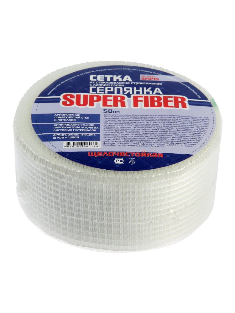 Серпянка — это лента, представляющая собой систему переплетенных стекловолокон. Серпянка имеет сетчатую структуру, что позволяет избегать попадания под ленту воздуха и образования вздутий и неровностей. Сетчатая структура покрыта равномерным слоем клея постоянной липкости, что позволяет качественно, быстро и технологично выполнять работы с ее использованием даже непрофессионалам. Применяется для внутренних работ, для армирования стыков гипсокартона, ДСП, оргалита и других листовых материалов, для армирования мест примыкания дверных и оконных коробок к стенам, для армирования трещин, углов и швов бетонных и оштукатуренных поверхностей, для армирования поверхностей стен и потолков. Прочная самоклеящаяся сетка 50 мм х 45 м для армирования швов, предотвращает трещины, устойчива к влаге и температуре, подходит для отделочных работ.