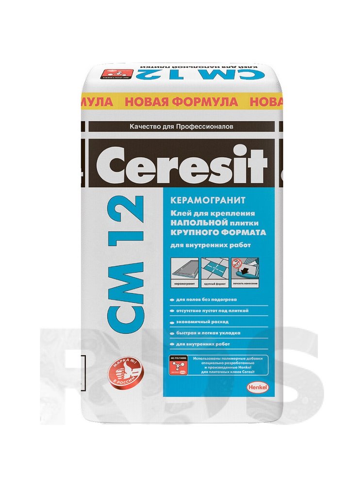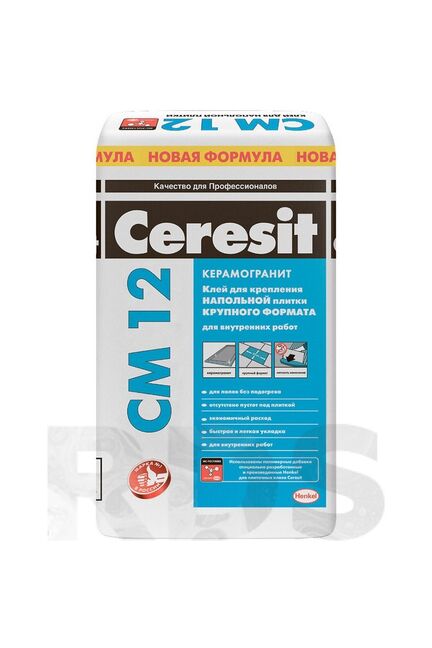 Клей для керамогранита и крупноформатной плитки Ceresit CM 12 - предназначен для крепления напольных керамогранитных, керамических и каменных плиток (кроме мрамора), преимущественно крупного формата (до 60х60 см), на недеформирующихся бетонных и цементных основаниях, на полах внутри зданий, в т.ч. во влажных помещениях с гидроизоляцией. Благодаря текуче-пластичной консистенции клей позволяет легко и быстро укладывать крупноформатную плитку без дополнительного нанесения клея на монтажную поверхность плиток, обеспечивая максимальный адгезионный контакт. Прочный клей для надёжной укладки напольного керамогранита, устойчив к влаге и морозу, подходит для пола с подогревом и интенсивных нагрузок.
