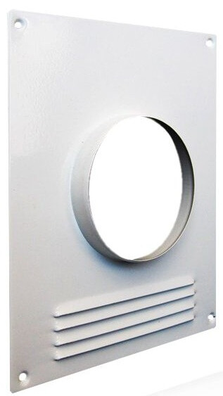 Площадка торцевая пластиковая с решеткой: предназначена для оформления вентиляционных отверстий и присоединения воздуховодов; настенный монтаж при помощи шурупов; материал: полистирол; размеры: высота 24см, ширина 20,5см, раст.между отверстиями креплений: вертик.22,4см, горизонт.18,4см,Φ внутр.отверстия 10см, цвет: белый;